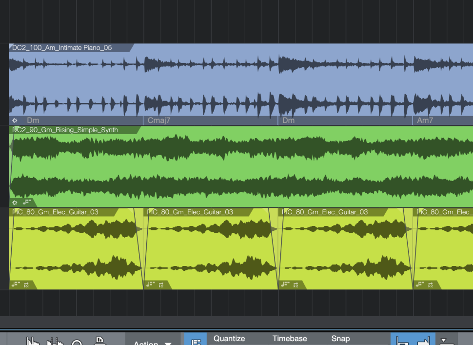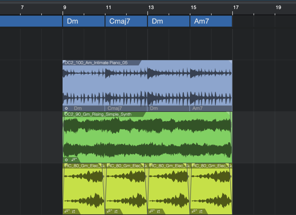 … und werden mit DC2_90_Gm_Rising_Simple_Synth.wav und PIC_80_Gm_Elec_Guitar_03.wav fündig und laden beide auf eigene Spuren. Von der Gitarre schneiden wir nur die Takte 3-4 aus und setzen diese vier mal hintereinander. In beiden Fällen aktivieren wir im Spur-Inspektor die Follow chords-Funktion, indem wir aus dem Dropdown den Universal-Modus wählen.