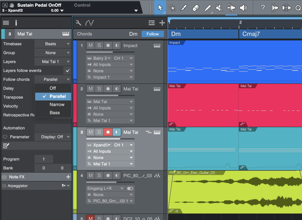 Den Akkord kopieren wir mal, ähnlich wie das Gitarren-Sample zuvor. Im Unterschied zu den Samples stellen wir den Follow chords-Modus der Bassline auf Bass und den des Akkords auf Parallel oder Narrow. Beide Modi unterscheiden sich meist nur marginal, hier ist Ausprobieren angesagt. Fertig ist das zweite inspirierte Playback ohne Reste der Ur-Idee.