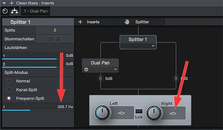 Ziehen Sie nun den Dual Pan aus dem Effekte-Browser direkt auf den Audio-Loop und regeln Sie die Left- und Right-Parameter auf die Mittenstellung. Dadurch wird das Signal in mono wiedergegeben, was später Sinn machen wird. Wechseln Sie jetzt im Insert-Fenster auf die Routing-Seite, ziehen Sie den Splitter über den Dual Pan und aktivieren Sie Frequenz-Split bei ungefähr 300 Hertz.