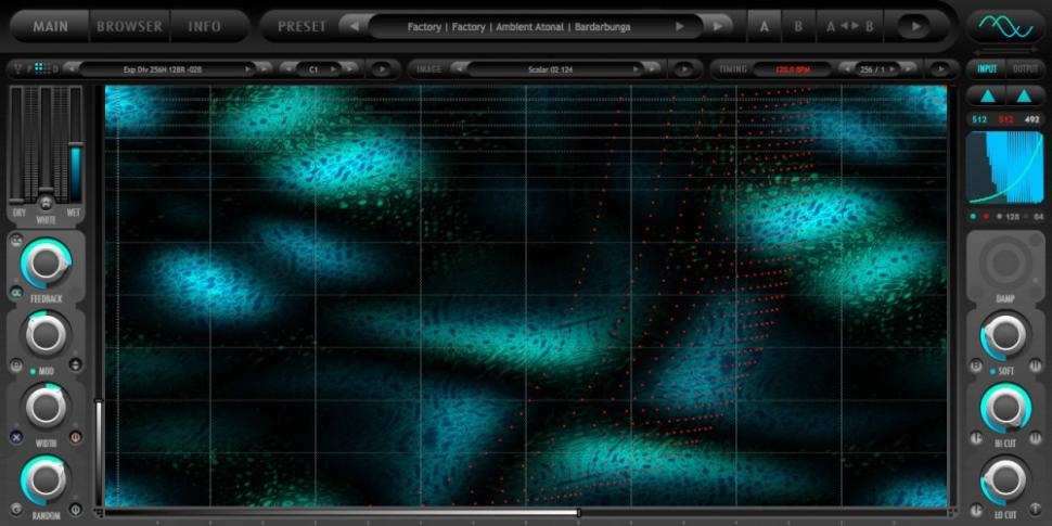 Eine Instanz von Kaleidoscope greift auf bis zu zwei Bilder zurück, um daraus Informationen zur Steuerung der Frequenz, Lautstärke und Panoramaposition abzuleiten. Jede vertikale Reihe ist dabei ein hochselektives Filter (Resonator), das mit bemerkenswerter Präzision nach Belieben gestimmt und moduliert werden kann. Während der String-Resonator schwingende Saiten nachbildet, erlaubt das Spring-Modell, die Resonanzfrequenzen zu stimmen, sei es um ein physikalisches Objekt zu simulieren oder Harmonien zu generieren. Zum Anregen der Resonatoren kommt wahlweise das Eingangssignal oder der integrierte Rauschgenerator zum Einsatz. Durch eine komplexe Interaktion der Charakteristika des Eingangssignals, der Resonatoreinstellungen, der Stimmung und Tonalität, der Bilddaten und der Timing-Parameter sind facettenreiche, äußerst lebendige Klänge möglich. Selbst aus unspektakulärem Audiomaterial lassen sich fantastische, sich entwickelnde Muster und polyrhythmische Strukturen erzeugen.