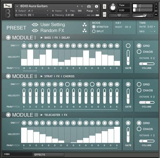 Die ''Hybrid Scoring Tools'' von 8Dio erfreuen sich einer großen Beliebtheit unter Film- und Game-Komponisten. Aura Guitars, der Neuzugang der Serie, wartet mit ausdrucksstark spielbaren Gitarren-Loops auf. Die Bedienoberfläche der 17 großen GB großen Library ist in drei Module unterteilt. Jedes davon kann eine eigene Gitarrenartikulation mittels Step-Sequenzer ansteuern. Als Klangquellen stehen 12 in zwei Dynamikstufen aufgenommene Instrumente zur Auswahl, darunter akustische und elektrische Gitarren und Bässe, Ukulele, Dobro und Mandoline. Dabei wurden sowohl einzelne Noten als auch Quintakkorde gesampelt. Melodisch spielbare Multi-Samples werden hingegen leider nicht geboten. In der obersten Spur der Sequenzer bestimmen Sie, welche Noten getriggert werden. Auch die Sequenzlänge ist regelbar. Durch die Möglichkeit, Velocity, Panoramaposition und Stimmung für jeden Schritt einzustellen, gelingen im Handumdrehen spannende Patterns. Sogar komplexe Poly-Rhythmen mit einander ergänzenden Melodien sind möglich. Bei den Akkordartikulationen können Sie mit dem Modulationsrad zwischen gedämpften und offenen Akkorden überblenden. Pfiffige Zufallsfunktionen liefern im Handumdrehen neue kreative Impulse. Die Effektseite beherbergt Filter, EQ, Bit- und Sampleratenreduktion, Stereo Delay sowie algorithmischen und Faltungshall. Schade, dass man die einzelnen Effekte nicht via Key-Switch aktivieren kann.