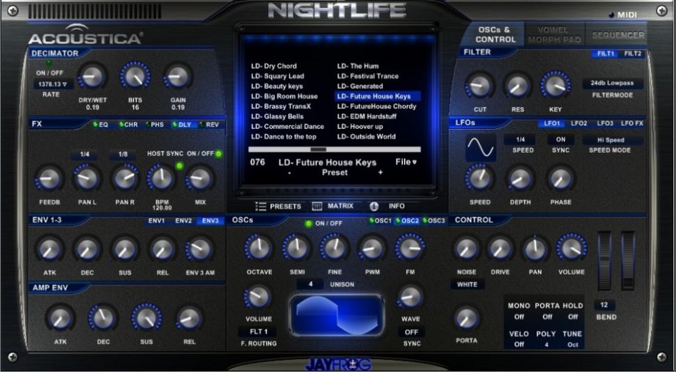 Der amerikanische Hersteller Acoustica bietet mit Nightlife einen komplexen Synthesizer im Plug-in-Format als Freeware an. Dem Namen entsprechend richtet sich der neue Synth vornehmlich an die Produzenten von EDM, House, Dance und Trance.