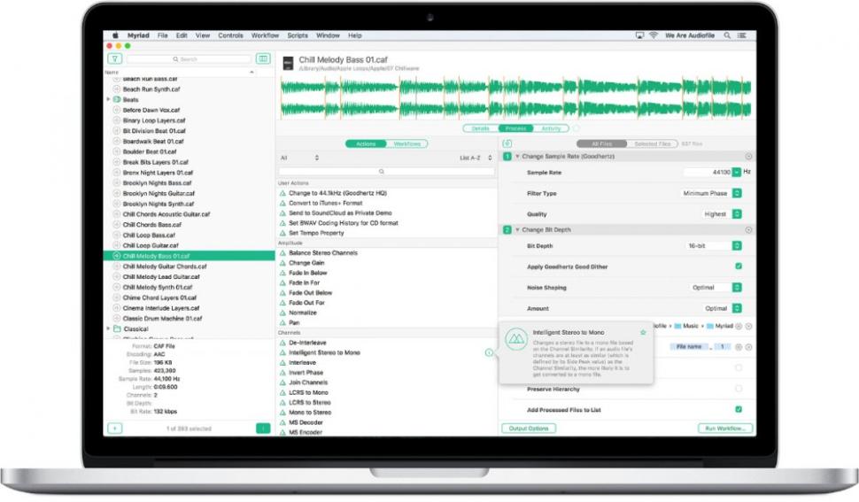 Neben zahlreichen kleinen Updates und Erweiterungen wurde auch die Oberfläche überarbeitet und kommt nun wesentlich übersichtlicher daher. Der komplette Workflow basiert auf Drag & Drop und ist selbsterklärend. Myriad zeigt sich in puncto Audioformate extrem flexibel und auch die gebotenen Aktionen decken alles ab, was das Leben im Studio erleichtert. Beispielsweise lassen sich in einem Rutsch die Stille wegschneiden, Fade-Ins und -Outs setzen, die Lautstärke normalisieren und schließlich MP3s speichern. Ebenso können hunderte Samples auf einmal transponiert und in 30-Sekunden-Demos verwandelt oder Loops automatisch in Slices geschnitten und im FLAC- oder OGG-Format exportiert werden. Dabei lassen sich sogar AudioUnits einbinden. Die zusammengestellten Aktionen können als Workflows gespeichert und jederzeit wieder abgerufen werden. Ferner ist auch ein Massenupload zu Soundcloud, Dropbox oder einem FTP-Server möglich. Dank einer Suchfunktion sind passende Optionen schnell gefunden und ein Info-Popup erklärt den Zweck jeder Aktion. Komfortabler geht's kaum.