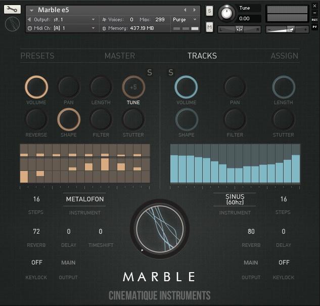 Mit Marble erweitern die Sample-Spezialisten von Cinematique Instruments ihr Repertoire innovativer Librarys für Kontakt. Die Klangerzeugung des Kreativwerkzeugs stützt sich auf zwei Sound-Slots, in die sich jeweils ein Multi-Samples laden lässt. Zur Auswahl stehen 63 Klangquellen, einige davon mit bis zu sechs Alternativ-Samples und bis zu acht Dynamikstufen. Dabei treffen akustische und elektrische Instrumente wie Gitarren, E-Piano, Bass, Marimba und Glockenspiel auf Synthesizerklänge, Ambient- und Sci-Fi-Sounds auf rohe Wellenformen und klassisches Schlagzeug auf synthetische Drums. Alle Sounds lassen sich chromatisch spielen. Das Herz von Marble stellt ein leistungsfähiger 16-Step-Sequenzer mit individuellen Spuren für die beiden Sample-Slots dar. Für jeden Schritt lassen sich unterschiedliche Parameter editieren, darunter die Anschlagstärke, Panoramaposition, Stimmung, Notenlänge, Abspielrichtung, Filterfrequenz und Distortion-Intensität. Auch Stottereffekte sind möglich. Für jeden der beiden Sound-Slots können Sie den Anteil des Delay- und Reverb-Effekts individuell einstellen. Zur Klangveredelung stehen darüber hinaus 13 globale Effekte bereit, darunter ein Tief- und ein Hochpassfilter, Distortion, Kompression, Faltungshall, Bit- und Sampleratenreduktion sowie ein Zufallsgenerator, der die Parameter aller Effekte beeinflusst. Der Clou ist, dass die Effektparameter nicht statisch sind, sondern mit dem kreisförmigen Marble-Symbol auf der Master- und Tracks-Seite oder dem Modulationsrad gesteuert werden können. Dabei können Sie den gewünschten Verlauf für jeden steuerbaren Effektparameter in einem eigenen 127-Step-Sequenzer einzeichnen. So gelingen nicht nur lineare, sondern auch äußerst komplexe Verläufe. Selbst aus unspektakulären Sounds lassen sich dabei eindrucksvoll animierte Sequenzen erzeugen. Nicht minder spannend ist die Möglichkeit, vier Zustände des Marble-Reglers abzuspeichern und diese via Key-Switch aufzurufen. Lebendige Klangmanipulationen sind so ein Kinderspiel. In der Praxis gelingen mit Marble eine Vielzahl interessanter Sounds, darunter Synth-Basslines, tonale Texturen, hypnotische Arpeggios und Riffs, akustische und elektronische Beats, futuristische Grooves, abgefahrene Glitch-Kreationen und experimentelle Ambient-Patterns sowie sich stetig entwickelnde Klangwelten. Die über 900 Presets demonstrieren eindrucksvoll den hohen musikalischen Nutzwert des Instruments.