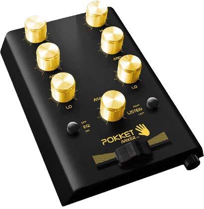 Die Geräte der Pokketmixer-Linie sind kaum größer als eine Zigarettenschachtel, haben mit Dreiband-EQs, einem Crossfader und Summen- sowie Kopfhörerwegen aber trotzdem alle zum Auflegen essenziellen Bestandteile dabei. Dank ihrer passiven Schaltung braucht man zum Betrieb keinen Strom. Die Vorverstärkung erfolgt einzig durch die verwendeten Musikplayer, aufgrund von EU-Richtlinien können derartige Boliden in der Regel allerdings nur mäßig laut eingestellt werden. Im Ergebnis kommen deshalb recht sehr geringe Pegel bei der verwendeten Anlage an. Der Pokketmixer Volume Plus soll Schluss mit dieser Misere machen. Durch eine neue Transformator-Technik ist er in der Lage, bis zu 10dB mehr an seinen Ausgängen abzuliefern als die Vorgänger. Ergänzend wurde der ohnehin schon solide Aufbau in Details verbessert. Als Eingänge bringt der Pokketmixer Volume Plus wie gehabt zwei 3,5mm Klinkenbuchsen mit, getrennt regelbare Summen- und Kopfhörerausgänge im gleichen Format erlauben separates Ausspielen und Abhören von Musik. Die EQs werden über einen Taster aktiviert, durch den passiven Aufbau muss man hierbei leider Lautstärke-Einbußen in Kauf nehmen. Ihr Klang ist dafür sehr gut, besonders wohlwollende Anhebungen sind komfortabel machbar. Der Crossfader ist vergleichsweise schwergängig, die Überblendung von Signalen geht trotzdem flüssig vonstatten. Störgeräusche waren im Test nicht auszumachen.