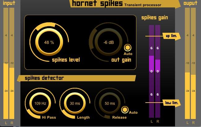 Transienten ergeben sich bekanntermaßen durch die flotten Ausreißer im Amplituden-Verlauf und hängen somit mit der Lautstärke (Audio-Level) und dem Kompressions-Verfahren zusammen. Im Unterschied zu herkömmlichen Kompressoren, die ab einem bestimmten Schwellenwert die Amplitude bändigen, will HoRNet einen relativen Threshold entwickelt haben. Dieser wird in einem Regler namens Spikes Level umgesetzt, der mittels zweier unterschiedlicher Hüllkurven im Hintergrund arbeitet. Diese sollen durch ihre langsamen und raschen Attack-Zeiten den relativen Anteil von Frequenzspitzen zu dem Signalkörper herausrechnen. Der Nutzer kann dann selbst bestimmen, wie viel Transienten-Energie zu der allgemeinen Lautstärke (Gain) beigemischt wird. Wer doch lieber selbst justieren mag, dem stehen eine Handvoll Parameter zur Verfügung. Beispielsweise können die Längen der aufgespürten Spitzen sowie die Release-Geschwindigkeiten beeinflusst werden. Zudem ist der Signal-Detektor mit einem Hochpass-Filter gepaart, um das Gewicht der tiefen Frequenzen zu reduzieren.