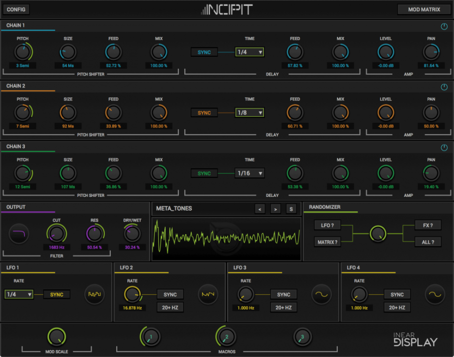 Zur schnellen Kontrolle von Einstellungen lassen sich die Wege einzeln abschalten. Die Pitch-Shifter gestatten Tonhöhenanpassungen um bis zu +/- zwei Oktaven. Feedback- und Size-Parameter erlauben weitere Klanganpassungen. Per Mix-Regler können Rohmaterial und Effekt-Signale kombiniert werden. Die Ergebnisse wirken im Vergleich bemerkenswert voluminös. Incipits Delay-Stufen klingen ebenfalls füllig. Ihre Echozeiten lassen sich synchronisieren, mit kleinen Werten kann man allerhand tonale Effekte erzeugen. Als weitere Parameter stehen Feedback und Mix bereit. Die Verstärker dienen der abschließenden Regulierung der Lautstärke- und Panoramaposition, bevor das Material der drei Kanäle zusammengeführt wird. Anschließend folgt ein resonanzfähiges Multimode-Filter mit den Charakteristika Hoch-, Band- und Tiefpass sowie Kerbfilter im Signalweg. Sein Sound ist wohlwollend und erstaunlich warm. Für Modulationen zeichnen vier synchronisierbare LFOs mit sieben Wellenformen und einem Frequenzbereich von bis zu 20 kHz verantwortlich. Ferner gibt es drei Makro-Regler. Steuersignale lassen sich via Routing-Matrix flexibel verschalten.