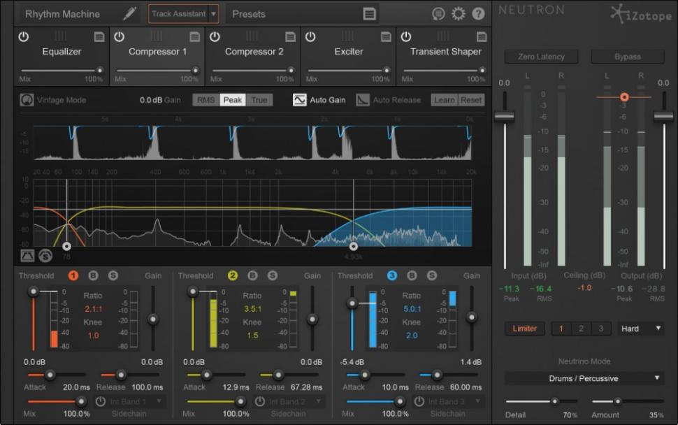 Doch werfen wir noch einmal einen genaueren Blick auf die Module, die Neutron beinhaltet: Der 12-bandige Equalizer konnte in unserem Test als universelles Werkzeug mit klarem, musikalischem Sound überzeugen. Jedes Band kann dabei als dynamischer Equalizer fungieren. Dank der flexiblen Sidechain-Optionen ist es beispielsweise möglich, einen bestimmten Frequenzbereich der Gitarrenspur abzusenken, wenn bei dem Gesang kollidierende Frequenzen auftreten. Nicht minder leistungsfähig zeigt sich der Kompressor, der wahlweise im Wideband-Modus oder als Dreiband-Kompressor arbeitet. Die Digital-Betriebsart empfiehlt sich für transparente, chirurgische Dynamikbearbeitungen, während Vintage das Klangverhalten analoger Klassiker nachbildet. Der dreibandige Exciter hingegen eignet bestens, um Audiomaterial mehr Höhenglanz, Druck, Wärme und Präsenz zu verleihen. Dabei können Sie zwischen vier Algorithmen mit eigenem Klangcharakter wählen. Der ebenfalls dreibandige Transient Shaper erwies sich als wirkungsvolles Werkzeug, um die Anschlag- und Ausschwingphase verschiedenster Signale zu bearbeiten. Mit seinen umfangreichen Einstellmöglichkeiten ist der Multiband-Limiter sowohl für das unauffällige Abfangen von Pegelspitzen als auch für pumpende Dynamikbearbeitung sowie maximale Lautheit gewappnet.