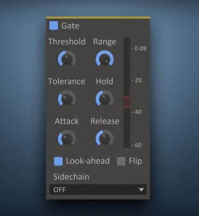 Wie auch andere Snapins übernimmt Gate nur eine einzelne Aufgabe: die Unterdrückung der Geräusche, sei es unerwünschtes Summen oder Rauschen. Zudem können durch Gate-Einstellungen die Hallfahnen zerstückelt oder die Beat-Dynamik überbetont werden. Was auch immer der Zweck des Einsatzes ist, Snapin bietet eine Handvoll Parameter zur Steuerung: Threshold und Range, Attack und Release, Tollerance und Hold. Ferner akzeptiert das Gate-Snapin das Signal von einem externen Sidechain, durch die sogenannte Flip-Funktion können Ducking-Effekte erzielt werden.