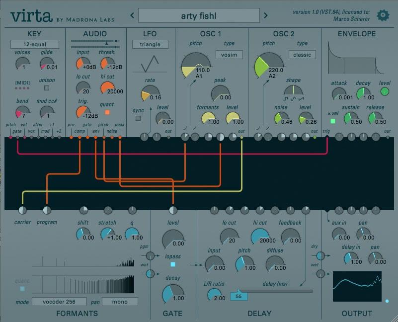 Mit Aalto und Kaivo hat Madrona Labs bereits zwei außergewöhnliche Synthesizer/Sampler auf Basis der gleichen semi-modularen Engine im Programm. Mit Virta folgt nun die beinahe logische Reinkarnation als Effekt-Plug-in. Doch mit netten Extras: Virta besitzt sowohl einen Audioeingang als auch zwei Oszillatoren zur internen Klangerzeugung. Neben klassischen Wellenformen können die Oszillatoren auch Formant-Sounds liefern, was die klangliche Bandbreite enorm erweitert. Dazu gesellen sich ein Vocoder-Modul sowie Gate- und Delay-Effekte. Dank des modularen Aufbaus kann jedes der vorhandenen Elemente der Klangerzeugung und als Modulationsquelle dienen. Hier geht der Spaß also erst richtig los. Virta kann als klassischer Vocoder arbeiten und externes Audiomaterial als Basis nutzen. Oder eine externe Stimme mit seinen synthetischen Stimmen kombinieren. Oder ein Tape-Delay-Effekt sein. Ebenso kann er ein Synthesizer sein, der von Audiomaterial gespielt wird (ähnlich eines Envelope Followers). Vor allem Drumloops und Stimmen liefern hier abgefahrenes, aber stets musikalisch brauchbares Material. Klanglich ist von Roboterstimmen über Metallisches bis hin zu atmosphärischen Sounds alles dabei, was das Herz begehrt, erfreulicherweise auch fernab bekannter Vocoder-Welten. Oder anders gesagt: Alles, nur kein 08/15. Die Presets des Plug-ins geben einen tollen Überblick über seine Fähigkeiten.