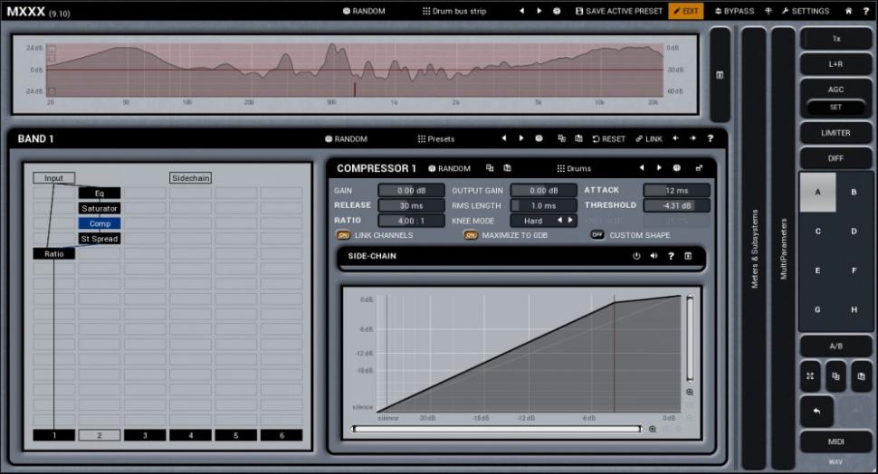 ''Bau dir deinen eigenen Supereffekt!'' könnte das Motto des neuen Plug-ins MXXX von Melda Production heißen. Zuerst wird das Eingangssignal in bis zu sechs Frequenzbänder aufgesplittet, die durch Crossover-Filter voneinander getrennt werden. In einer flexiblen Routing-Matrix, die auch die Sidechain-Eingänge einbezieht, können Sie nun für jedes Band eine eigene Effektkette zusammenstellen. Mit 73 Bausteinen steht dazu quasi die gesamte Palette des Herstellers zur Verfügung: Modulations-, Stereo-, Distortion-, EQ-, Dynamik-, Reverb- und Delay-Effekte sowie verschiedene Verschaltungsoptionen (Building Blocks) und Synthese-Einheiten inklusive des kompletten Power Synth. Abgerundet wird der Funktionsumfang durch Hilfsmodule wie Multi-Analyser, MCompare oder Auto-Align.
