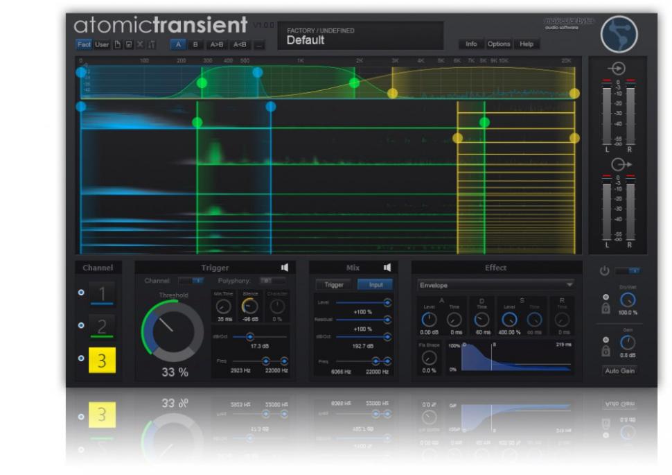 atomictransient ist ein Multikanal-Transienten-Prozessor, der sogar polyphones Audio-Material verarbeiten kann. Der Nutzer kann drei Kanäle gleichzeitig auf verschiedene Frequenzbereiche verteilen, um Schlagzeuge und Instrumente getrennt voneinander zu verarbeiten. Sind die Transienten bereits erkannt, stehen LFO-gesteuerte Filter und ADSR-Hüllkurven zur Klangformung zur Verfügung. Dabei können die Hüllkurven nicht nur dynamisch in Attack und Sustain geändert, sondern mit einer definierten ADSR-Kurve überschrieben werden.
