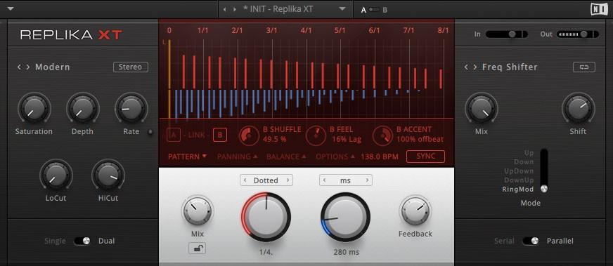 Replika XT ist im Herzen ein klassisch parametrisierter Delay-Effekt, aber auch mit allerlei Finessen. So lässt sich das Echo nicht einfach nur in Millisekunden oder synchron zum Beat einstellen, sondern bietet im Dual-Modus zwei Delay-Einheiten, die unabhängig voneinander eingestellt werden und entweder seriell oder parallel laufen. Shuffle, Nudge und Betonungen pro Einheit inklusive. Das Plug-in bietet fünf (statt vorher drei) Betriebsarten: Modern, Vintage Digital, Analogue, Tape und Diffusion, die einerseits einen individuellen Sound beisteuern und andererseits unterschiedliche Optionen mit sich bringen. So tendiert Diffusion eher in Richtung Raumklang, während sich mit Tape authentische Dub-Delays erzeugen lassen. Das Signal lässt sich schließlich mit sieben weiteren Effekten garnieren, darunter Flanger, Phaser und Pitch-Shifter. Zwar sind diese Effekte an sich nicht spektakulär, mutieren als Teil des Feedbacks jedoch zu wunderbaren Sounddesign-Tools. Schon alleine das Kombinieren der Modi mit den sieben Effekten und das Experimentieren mit verschiedenen Klangquellen sorgt für kurzweilige Abende.