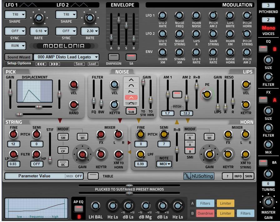 Hinter dem Namen Modelonia verbirgt sich ein leistungsfähiger Physical-Modelling-Synthesizer. Dieser bildet das physikalische Verhalten von Saiten- und Blasinstrumenten nach. Beide Synthesemodelle lassen sich flexibel anpassen. Im Gegensatz zu vergleichbaren Plug-ins beschränkt sich die Klangerzeugung von Modelonia ganz auf die Physical-Modelling-Technik.