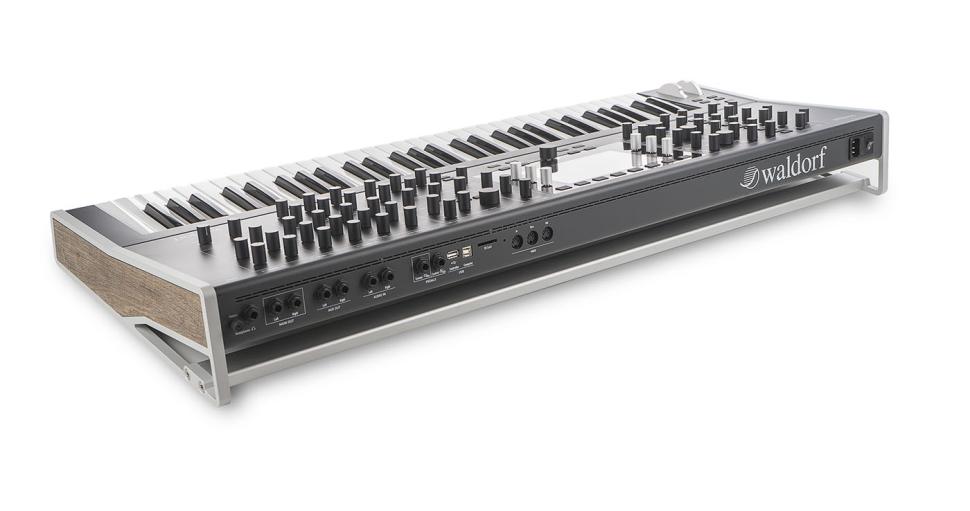 Die Rückseite des mit Holzteilen bestückten Gehäuses offeriert zwei Stereo-Ausgänge, einen Stereo-In, einen Kopfhörer-Anschluss, ein MIDI-Trio, Pedal-Eingänge für Sustain und Control, sowie einen USB-Eingang für MIDI-Controller, einen USB-Ausgang zur Verbindung mit einem Computer und einen Volume-Regler. Last but not least gibt es auch einen Slot für SD-Karten, dem Hauptspeichermedium des Quantum. Seinen Strom erhält der Synth über einen Kaltgeräteanschluss, Probleme mit Netzteilsteckern sind also nicht zu erwarten. Alles andere wäre für einen Synth dieser Klasse auch nicht angemessen.