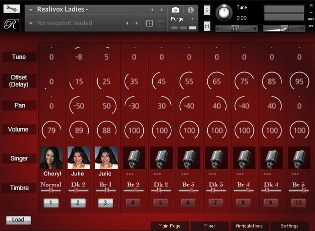 Die Library beinhaltet fünf Sängerinnen unterschiedlichen Charakters: Cheryl hat eine weiche schmeichelnde Stimme, Toni intoniert mit einer R'n'B-Stimme, die sich besonders gut in den tieferen Regionen anhört. Patty hat eine kräftige, gut für höhere Lagen einsetzbare Pop-Stimme. Die mittlere Lage deckt Julie prima ab und Teresa brilliert mit einer Opernstimme.