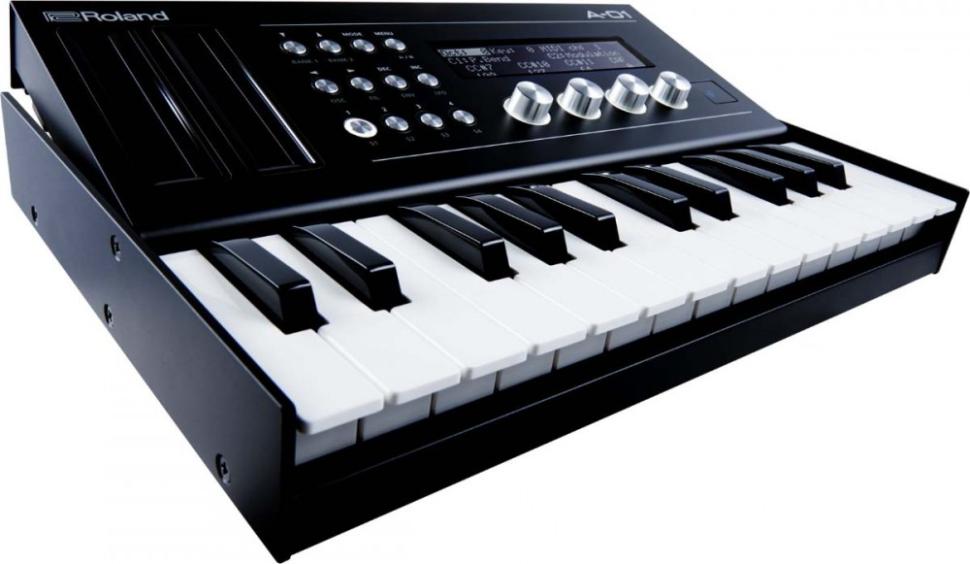 Das Gehäuse des A-01 entspricht von den Ausmaßen her der bereits bekannten Boutique-Serie, daher lässt es sich auch problemlos in das separat oder im vergünstigten Bundle A-01K erhältliche Keyboard K-25m einspannen und plan oder angewinkelt betreiben. Ebenso wie die Boutique-Synthesizer erfolgt die Stromversorgung wahlweise über Batterien oder USB. Die Oberfläche unterscheidet sich aber deutlich: Statt einer Vielzahl Miniatur-Regler und -Fader finden Sie hier lediglich vier große Drehregler. Diese sind zwar etwas flach ausgefallen, hinterlassen aber ansonsten mit angenehmer Haptik und ordentlichem Drehwiderstand einen sehr wertigen Eindruck. Weiteres Unterscheidungsmerkmal ist das große Display, das direkt über den Reglern angeordnet ist und alle relevanten Details gut lesbar weiß auf schwarz wiedergibt. Links daneben finden Sie zwölf silberne Taster, angeordnet in drei Reihen. Auch diese Taster fassen sich gut an, haben einen ordentlichen Druckpunkt und geben dank Hintergrundbeleuchtung visuelles Feedback. Die zwei Ribbon-Controller links sind standardmäßig auf Pitchbend- und Modulation eingestellt, können aber auch andere Controller senden. Anschlüsse Neben der Haptik der Bedienelemente sind natürlich auch die Anschlüsse entscheidendes Kriterium bei der Wahl eines Controllers. Der A-01 bietet einen CV- und Gate-Ausgang für betagte und moderne Analogsynthesizer. Die ausgegebene Spannung lässt sich mit dem Menü feinstimmen und sogar skalieren, sodass auch ein nicht exakt mit 1V/Okt arbeitender Moog-Synthesizer oktavrein angesteuert werden konnte sehr schön! Ein Umschalten auf Hz/V ist leider nicht vorgesehen, sodass ältere Synthesizer von Korg oder Yamaha draußen bleiben müssen. Dafür gibt es das obligatorische MIDI-Pärchen sowie Micro-USB zum Anschluss an den Computer. Highlight dürfte aber zumindest für Besitzer eines kompatiblen Apple-Gerätes das eingebaute Bluetooth LE sein. So können Sie z.B. mit Ihrer iPad-App drahtlos per Bluetooth über den A-01 per CV/Gate einen alten Analogsynthesizer ansteuern. Synthesizer Wer bei acht Bit an die Chipsounds alter Heimcomputer denkt, liegt hier nur bedingt richtig. Im A-01 wird eine 8-Bit-CPU verwendet, um einen virtuell-analogen Synthesizer zu erzeugen. In Verbindung mit dem LoFi-10Bit D/A-Converter entstehen sehr direkte und durchsetzungsfähige Sounds, die man wohl am treffendsten als ''vintage-digital'' bezeichnen kann. Abgehört wird per eingebautem Lautsprecher oder Kopfhörerausgang.
