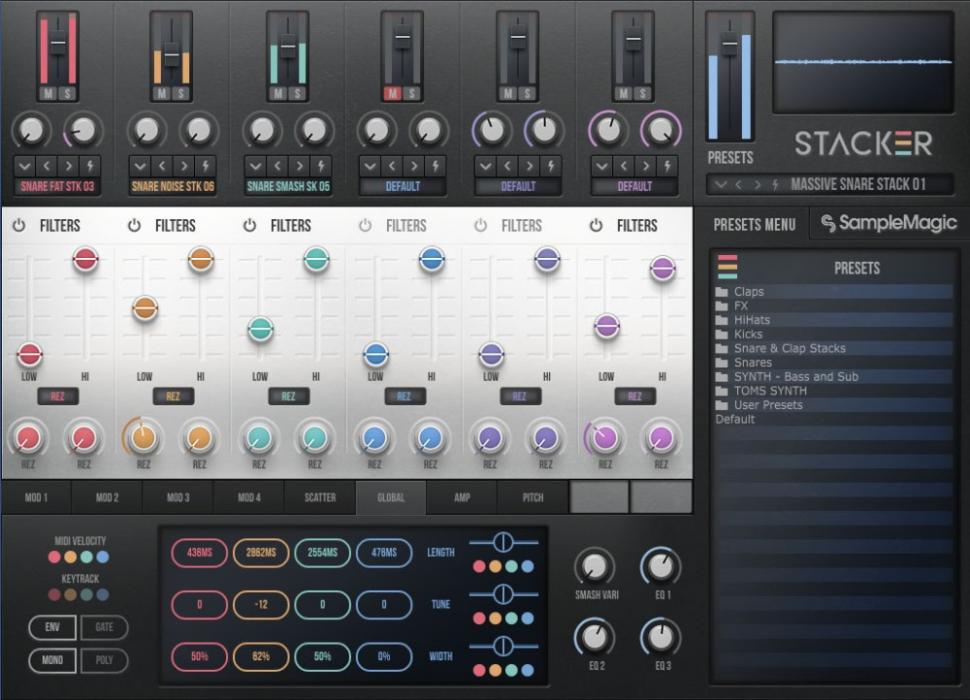 Keine Frage, das Erstellen Club-tauglicher Drums ist eine Kunst für sich: Für einen besonders fetten Sound werden dabei oft mehrere Klänge geschichtet. Mit Stacker bietet Sample Magic nun eines der bislang leistungsfähigsten Werkzeuge für diese Aufgabe an. Um den Drumsound Ihrer Träume zu erzeugen, lassen sich bis zu drei Samples und der integrierte Synthesizer kombinieren. Für jedes Layer können Sie Parameter wie Lautstärke, Stimmung, Panoramaposition, Sample-Start und Abspielrichtung anpassen. Natürlich bietet jedes Element seine eigene Lautstärke- und Pitch-Hüllkurve und sein eigenes Multimode-Filter. Mit dem Drumsynthesizer können Sie bereits viele klassische analoge Schlagzeugsounds erzeugen. Das Erstellen von Drumkits mit mehreren Sounds ist leider nicht möglich.