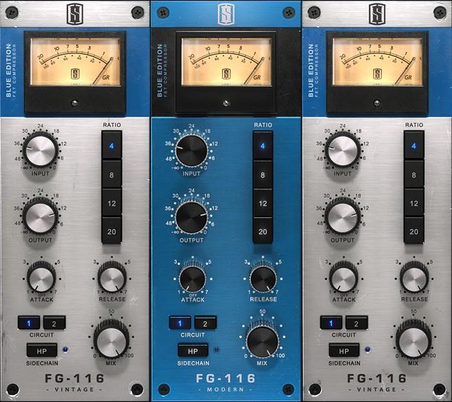 Der FG-116 Blue FET Vintage Compressor ist eine detaillierte Nachbildung des 1176 Rev A, auch Bluestripe genannt. Wie beim Vorbild gibt es Bedienelemente für Eingangs- und Ausgangspegel, Attack- und Release-Zeiten sowie vier Ratio-Werte. Im Gegensatz zum Original lassen sich Letztere leider nur einzeln anwählen. Die gemeinsame Aktivierung aller Ratios, ein Geheimtipp unter Tontechnikern, funktioniert zumindest derzeit noch nicht. Als neue Optionen sind ein zuschaltbares Hochpassfilter im Sidechain-Weg und ein Mix-Regler für Parallelkompression vorhanden. Via Circuit-Schaltern kann man zwischen dem typisch weichen, leicht mittigen Vintage-Sound und dem etwas kernigeren ''Refurbished''-Charakter umschalten. Der Grundklang bleibt natürlich erhalten, es geht lediglich um Nuancen. Der FG-116 Blue FET Modern Compressor bietet den gleichen Funktionsumfang, allerdings arbeiten die virtuellen Schaltkreise hier mit weniger Nebengeräuschen. Die Resultate wirken dementsprechend klarer. Zudem bietet der Attack-Regler einen deutlich erweiterten Regelbereich, lange Zeitwerte für etwa Drum-Bearbeitungen sind somit kein Problem.