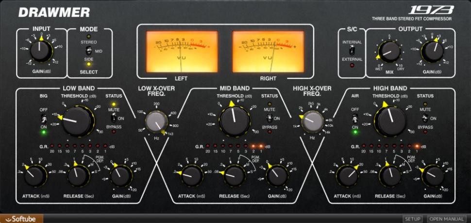 Nachdem Softube kürzlich bereits den Drawmer S73 vorgestellt hat, ein auf Presets basierendes Plug-in nach Vorbild des Multiband-Hardwarekompressors 1973, liefert der Hersteller nun eine Komplettemulation mit sämtlichen Stellgrößen nach. Es gibt sogar einige Features zu entdecken, die man beim Original vergeblich sucht. Der 1973 bietet drei Bänder, die sich unabhängig voneinander editieren lassen. Sie arbeiten mit Soft-Knee-Charakteristik, der Bearbeitungsgrad beziehungsweise die Ratio richtet sich also nach dem Pegel eingehender Signale. Es gibt Parameter für Schwellenwert, Lautstärke und Attack- sowie Release-Zeiten. Alle Bänder können einzeln stumm oder auf Bypass geschaltet werden, was speziell Einsteigern die Arbeit sehr erleichtert. Die tiefste Instanz hat ferner eine Big genannte Option dabei. Sie wirkt auf den Steuerweg ein und sorgt, selbst bei harter Kompression, für satten Bass. Im Höhenband gibt es einen ähnlichen Parameter namens Air, der für ein offeneres Klangbild sorgt. Die Übergangsfrequenzen zwischen den drei Bearbeitungsstufen lassen sich in einem weiten Bereich verschieben. Parallelkompression ist dank Mix-Poti kein Problem. Im Gegensatz zur Hardware kann der softe 1973 auch als M/S-Werkzeug dienen. Für Mitte und Seite gibt es getrennte Parametersätze. Zudem wurde er um einen Sidechain-Weg erweitert.