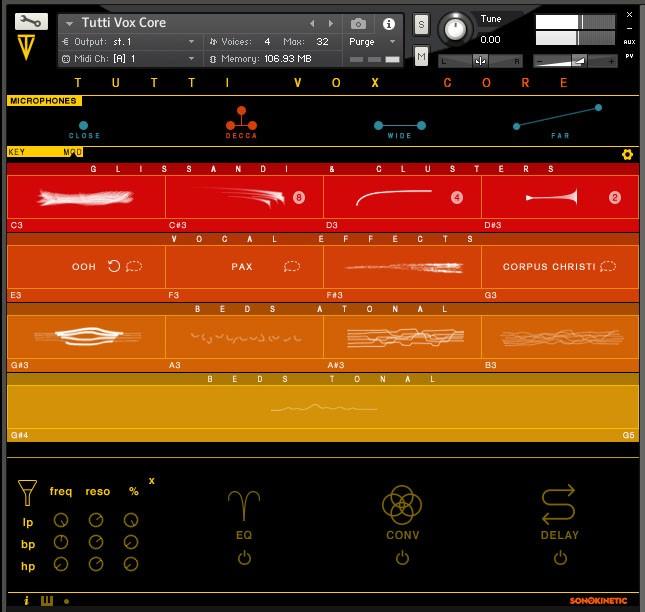 Tutti Vox ist eine rund 25 GB große Sample-Library mit einem Fokus auf den Effektklängen eines 48-köpfigen sinfonischen Chors. Die Kollektion setzt sich aus drei Kontakt-Instrumenten zusammen: Das Patch Tutti Vox Core enthält Glissandi, verschiedene dynamische Gesangseffekte wie Crescendi, Decrescendi, Cluster, Riser, Falls, Flüstern, Pfeifen sowie tonale und atonale Texturen (Beds).