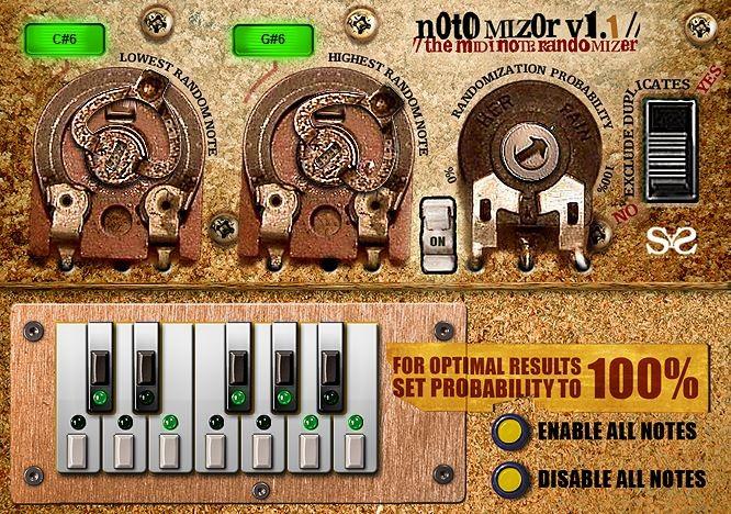 Wir vermuten, dass der Entwickler den etwas kryptisch erscheinende Namen n0t0miz0r aus den Begriffen Note und Randomizer zusammensetzen, denn dies beschreibt auch gleich die wesentliche Funktion des Plug-ins. n0t0miz0r wird zwischen MIDI-Notensequenz und Klangerzeuger geschaltet und ändert zufallsbasiert die Notenwerte. Hierbei können Sie über die leicht Steampunk-angehauchte Oberfläche den Bereich der zu erzeugenden Noten einschränken, wenn Sie insbesondere Ihre Hochtöner und Ohren schützen und nicht den vollen Notenumfang von C0 bis G10 nutzen wollen. Auch die Wahrscheinlichkeit, mit der die eingehenden Noten durch zufällige Notenwerte ersetzt werden, ist zwischen 0% (=keine Änderung) und 100% einstellbar.