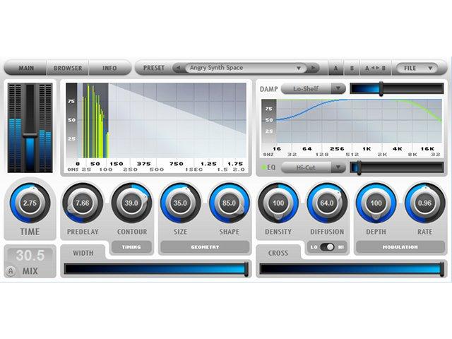 Eine Dämpfungsfunktion und ein Equalizer gestatten eine flexible Bearbeitung der tonalen Charakteristik des Nachhalls. Eine weitere Spezialität des Hallprozessors ist der Cross-Parameter, der bestimmt, inwieweit der linke Kanal des Eingangssignals in den rechten überspricht und umgekehrt. Dieser True-Stereo-Modus beeinflusst gemeinsam mit dem Width-Regler die Stereobreite des Halleffekts. Angenehm groß dimensionierte Anzeigen geben Aufschluss über die Zeit- und Frequenzcharakteristika des Effekts. Aufgrund seiner geringen und darüber hinaus anpassbaren CPU-Last kann man das Plug-in auch auf Laptops betreiben oder im Studio zahlreiche Instanzen nutzen. Nützliche Details wie ein ergonomischer Browser sowie eine A/B-Vergleichsfunktion runden die Ausstattung ab.
