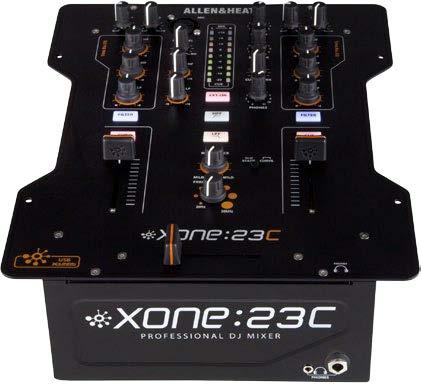 Allen&Heath hat dem Xone:23C ein stabiles Metallgehäuse spendiert, das zwei Kanalzüge beherbergt. Da sich in beiden Kanälen die Signale der analogen Eingangsquellen mit Pegelreglern parallel steuern lassen und damit bis zu vier Zuspieler gleichzeitig genutzt werden können, hat der Hersteller die Bezeichnung „2+2-Mixer“ für das Gerät gewählt. Beide Kanalzüge sind mit Fadern und Dreiband-Kill-Equalizern ausgestattet. Durch Drücken eines Schalters gelangen die Kanalsignale in ein analoges, spannungsgesteuertes Filter, das über eine wählbare Hochpass- und Tiefpass-Charakteristik sowie eine separate Resonanz-Steuerung verfügt. Parallel zur Aktivierung des Filterwegs lassen sich die Signale in eine externe Effektschleife leiten. Der Crossfader des Xone:23C ist den beiden Kanälen fest zugeordnet und besitzt zwei umschaltbare Fader-Verläufe. Für die Steuerung der Ausgangssignale ist der Mixer mit separaten Reglern für den Master-, Booth und Kopfhörerausgang ausgestattet. Im Inneren des Mixers befindet sich eine Soundkarte mit vier Ein- und Ausgängen, die mit 24 Bit bei 96 kHz arbeitet, und sich in Kombination mit der enthaltenen Software Cross LE als Timecode-Schnittstelle einsetzen lässt.