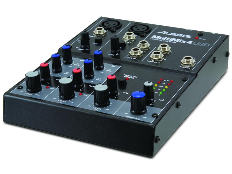 Alesis präsentiert mit dem Multimix 4 USB einen Kleinmixer in Vollausstattung. Mit Phantomspeisung, Trittschallfilter, Hi-Z-Eingang, Equalizer, vor allem aber USB-Schnittstelle hat der Hersteller alle für das Desktopstudio wichtigen Schnittstellen in einem kompakten Gehäuse vereint. Für real weniger als hundert Euro finden Vokal- oder Instrumentenmikrofon, hochohmige Instrumente und Linesignale aus Synthesizer, Groovebox, Drumcomputer oder Plattenspieler ihren Weg in den Computer. Der Multimix 4 USB empfiehlt sich damit nicht nur für schnelles Computer-Recording, sonder ist auch bei Nachvertonung, Video- und Audioschnitt oder bei Podcasts eine unentbehrliche Hilfe.