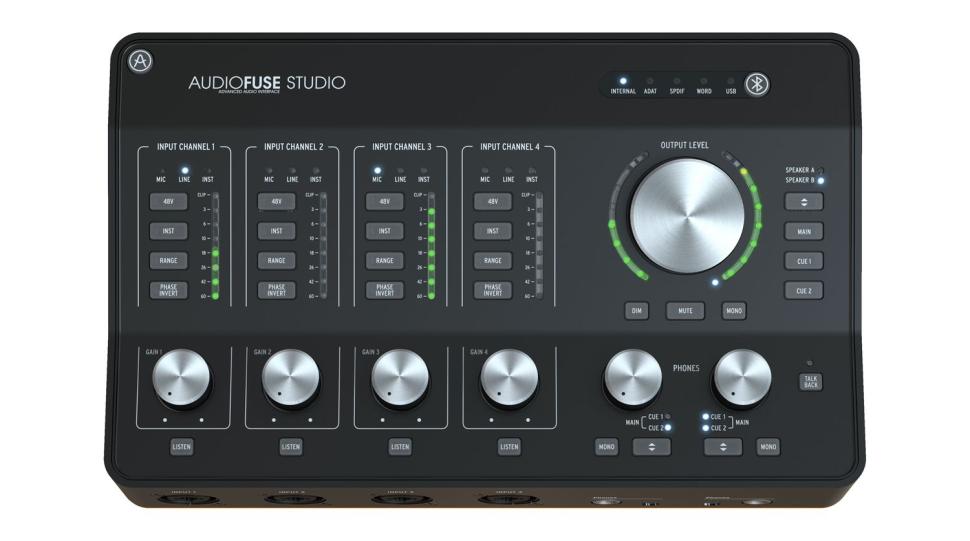 Die umfangreiche Monitor-Sektion erspart einen zusätzlichen Monitor-Controller. Separate Taster für die Umschaltung zwischen zwei Boxenpaaren sowie Main- und Cue-Mixen, Dim, Mute, Mono und sogar Talkback ergänzen den großen gerasterten Volume-Regler mit zwei LED-Anzeigen. Die vier Audioeingänge sind als XLR/Klinke-Kombibuchsen zum schnellen Anschluss eines Mikrofons oder Instruments auf die Vorderseite platziert, ebenso wie die beiden Kopfhörerausgänge. Als Besonderheit ist ein Bluetooth-Empfänger mit aptX und AAC integriert, um unkompliziert ein Smartphone einzubinden. Das funktioniert auch im Standalone-Betrieb; AudioFuse Studio (Jetzt auf Amazon kaufen) kann ohne Computer als flexibler Digitalmixer genutzt werden.