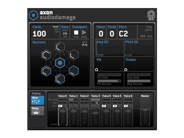 Spannend, originell und abstrakt sind Attribute, die nicht nur die Optik, sondern auch den Klang von Axon, der neuesten Kreation von Audio Damage, treffend beschreiben. Das Herz der Percussion-Maschine ist ein neuronaler Sequenzer, der sieben Synthesizerstimmen, sogenannte Neuronen, ansteuert. Die Neuronen können einander frequenz- und ringmodulieren, wobei vielfältige Verschaltungen möglich sind. Dabei bieten sie unabhängige Bearbeitungsmöglichkeiten für die Tonhöhe, Klangfarbe, Frequenzmodulation und den Amplitudenverlauf.