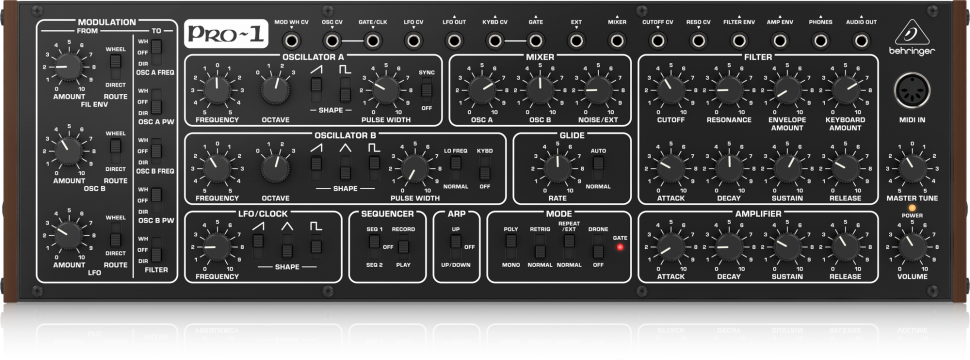 Die Klangerzeugung wurde identisch vom Original übernommen. Zwei Oszillatoren stellen die Wellenformen Rechteck und Sägezahn zur Verfügung, die Pulsweite ist modulierbar. Oszillator 2 bietet zusätzlich noch eine Dreieckwelle. Als Besonderheit lassen sich für Mischformen auch mehrere Wellenformen gleichzeitig aktivieren. Oszillator 1 lässt sich hart synchronisieren, die sehr gut klingenden Sync-Sounds bei Modulation der Tonhöhe des Slave-Oszillators sind ein Markenzeichen des Pro-One und eines der Highlights des Behringer-Klons. Oszillator 2 lässt sich auch als zweiter LFO nutzen. Beim Pro-1 (jetzt auf Amazon kaufen) lassen sich für duophones Spiel beide Oszillatoren getrennt in der Tonhöhe steuern, eine sinnvolle Erweiterung gegenüber dem Original!