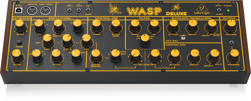 Zwischen seinen Nachbauten legendärer analoger Synthesizern und Drumcomputer überrascht uns Uli Behringer auch gerne mal mit einem Exoten. Der vom kreativen Chris Huggett (u.a. verantwortlich für den OSCar oder aktuell Novation Peak und Summit) Ende der 70er Jahre entwickelte WASP war aufgrund des grellgelben Plastikgehäuses billigster Bauart kaum zu übersehen, und genauso giftig wie die Farbe war auch der Klang. Behringer lässt die Wespe in der vor allem hardwareseitig deutlich verbesserten Deluxe-Version neu aufleben.