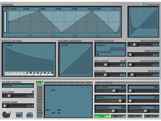Seit seiner ersten Version von 2002 hat sich Rhino zu einem wahren Synthesemonster entwickelt: In der aktuellen Version beherrscht der Klangerzeuger subtraktive, additive und FM-Synthese, Amplituden- und Ringmodulation sowie Sample-Wiedergabe. Bereits oszillatorseitig schöpft das Plug-in aus dem Vollen: Pro Stimme stehen sechs Oszillatoren mit einem Vorrat von Hunderten von Wellenformen bereit. Eigene Wellenformen können dabei mithilfe eines additiven Generators oder in Form von (Multi-)Samples geladen werden.