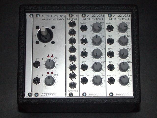 Bevor die Suche nach dem richtigen Modul beginnt, gibt es einen wichtigen Punkt zu bedenken. Während im DJ-Bereich sämtliche Geräte in stereo gehalten sind, ist eine zweikanalige Auslegung im Modularsektor eher die Ausnahme. Dies bedeutet, dass alle Bearbeitungsstufen doppelt vorhanden sein und auch gesteuert werden müssen. So kann bereits ein einfacher Filtersweep eine Herausforderung sein, denn Regler für linkes und rechtes Signal wollen gemeinsam bewegt werden. Abhilfe schafft ein Modul wie der A-174-1 Joystick, der Steuersignale sendet. Mit X- und Y-Achse stehen hier gleich zwei Werte bereit, Steuerspannungen mittels Verteiler an linken und rechten Kanal zu schicken. Ein solcher Verteiler ist das A-180 Multiple, welches Eingangsspannungen an mehreren Ausgängen bereitstellt.