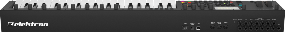 Alle Anschlüsse befinden sich auf der Rückseite. Der Sound gelangt durch einen Kopfhörer- und einen Stereoausgang an die Außenwelt, im Gegensatz zur Desktop-Version gibt es auch vier analoge Stereoausgänge zur individuellen Abnahme jedes der vier Tracks. Sie können den Sound des Digitone Keys auch verlustfrei per Overbridge in die DAW führen, ebenfalls in Summe oder als einzelne Tracks. MIDI, Audio und Clock/Synchronisation wird dabei nur über ein USB-Kabel realisiert. Im Test lief dies absolut problemlos und stabil. Ein dickes Lob dafür an Elektron!