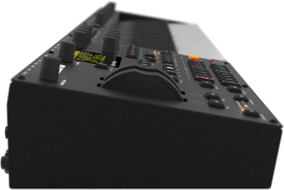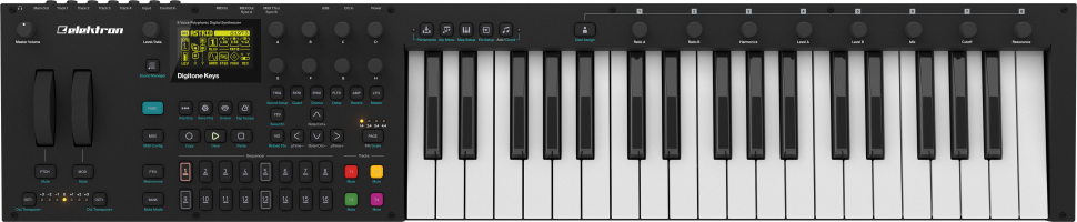 Die Desktop-Version wurde quasi unverändert in den Digitone Keys integriert. Dies erinnert an die großen Keyboard-Versionen des Access Virus oder der Monomachine und sorgt für eine etwas ungewöhnliche Optik. Es wirkt, als ob die Spielhilfen (Pitchbender, Modulationsrad etc.) sowie das Keyboard mit zusätzlichen Bedienelementen einfach nur links und rechts an die Desktop-Version herangeschweißt wurden. Vor allem die räumliche Trennung zwischen Spielhilfen und Keyboard durch die Groovebox-Sektion dürfte klassische Keyboarder ein wenig irritieren.