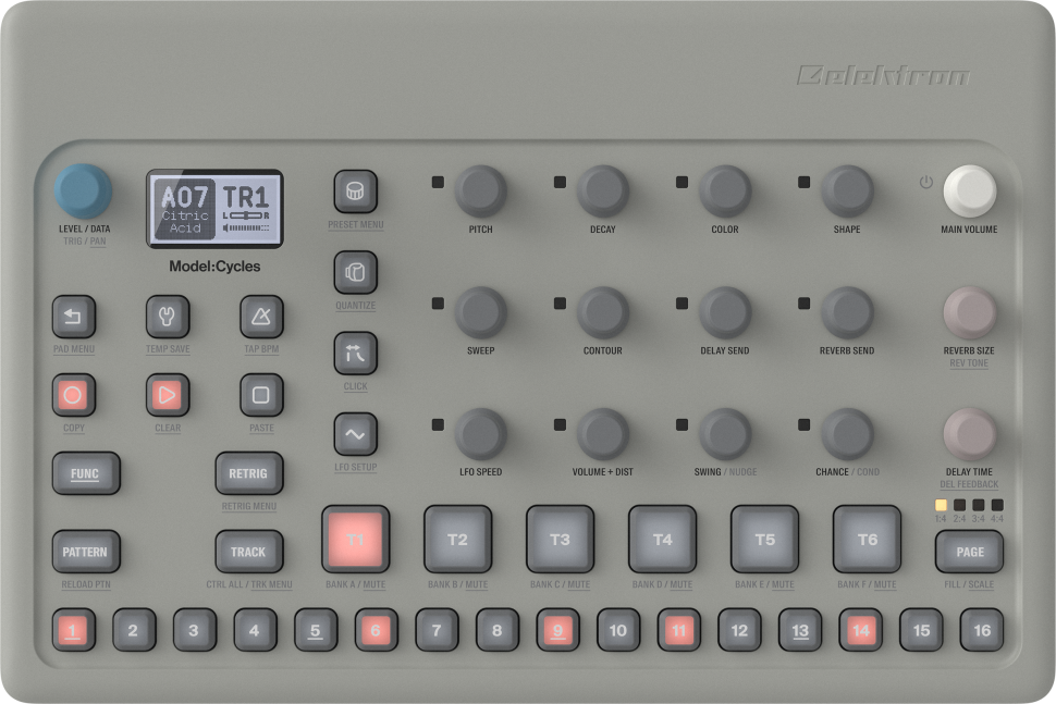 Die Bedienung erfolgt mit Hilfe der Taster, Regler und des LC-Displays. Letzteres ist mit 128x64 Pixeln doch recht klein geraten und auch nicht sonderlich gut ablesbar. Da der Model:Cycles aber für Elektron-Verhältnisse mit relativ viel Reglern ausgestattet ist und alle wichtigen Funktionen und Klangparameter im direkten Zugriff stehen, geht die grundlegende Bedienung bereits nach kurzer Einarbeitungszeit sehr flüssig von der Hand. Zwar muss für speziellere Funktionen der FUNC-Taster in Kombination mit anderen Bedienelementen genutzt werden, was gewisse Verrenkungen erfordert und den Spielspaß dann wieder ein wenig einschränken kann. Wer aber die „großen“ Geräte von Elektron kennt, für den ist die Bedienung des Model:Cycles ein Kinderspiel. Und selbst diejenigen, die aufgrund er komplexen und doch sehr speziellen Bedienung und Speicherhierarchie bisher die Finger von einem Elektron-Gerät gelassen haben, könnten durchaus ihre Freude am Model:Cycles haben.