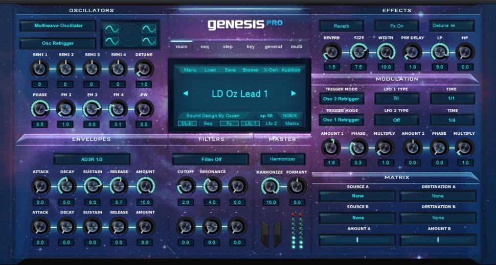 Die Idee hinter Genesis Pro ist, fette Sounds möglichst schnell und einfach zu kreieren. Dazu stehen zuerst drei verschiedene Oszillator-Arten bereit. Mod Oscillator ermöglicht FM-Synthese, Rom Oscillator spielt ROM-Samples ab und der Multiwave Oscillator hat gleich vier herkömmliche Oszillatoren im Analog-Stil mit sieben klassischen Wellenformen am Start. Der Clou: Entweder kann eine Osc-Sektion im Solo Mode einzeln oder es können per Multi Mode alle drei gleichzeitig erklingen. Zudem lässt sich jede der drei Abteilungen über verschiedene Bereiche der MIDI-Tastatur mappen, sodass verschiedene Sounds gleichzeitig gespielt werden können. Der weitere Signalweg hinter den Oszillatoren verläuft schließlich klassisch mit ADSR-Hüllkurven, Filter, Effekten, LFOs sowie Master Effekten am Ende. Zusätzlich bietet eine Mod-Matrix zwei Slots für Modulationsverbindungen aus zahlreichen Quell- und Zielparametern. Abgerundet wird alles unter anderem durch Step Sequencer, Arpeggiator und eine clevere Auto Chord-Funktion.