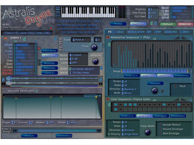 Die Synth-Edit-Kreation Astralis Orgone Lite ist eine frei erhältliche Version des Synthesizers Astralis Orgone mit reduziertem Funktionsumfang. Bei beiden virtuellen Instrumenten basiert die Klangerzeugung auf Samples, wobei in Orgone Lite nur 25 digitalisierte Klänge zur Verfügung stehen und im Gegensatz zur Vollversion keine eigenen Audiodateien geladen werden können. Die Samples lassen sich wahlweise vorwärts oder rückwärts abspielen, und in einem grafischen Editor kann bei Bedarf ein Loop definiert werden.