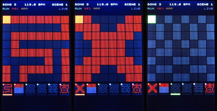 Die Sequenzen lassen sich transponieren und zeitlich verschieben, in der Laufrichtung ändern und sogar über vorgefertigte Muster (die oftmals auch lustige Bildchen auf dem Display abbilden) komplett neu anordnen. Einzelne Tracks lassen sich bei der Live-Performance spontan muten und durch selbst gespieltes ersetzen, wobei der eingebaute Arpeggiator hilfreich ist.