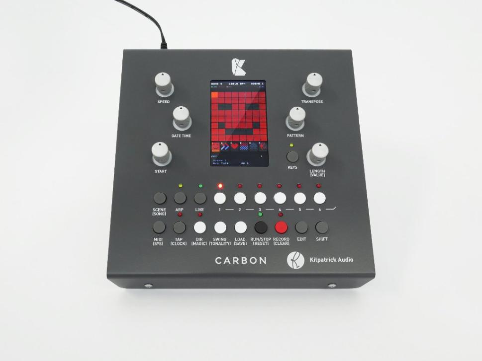 Carbon ist ein Standalone-Sequenzer im Desktop-Format und basiert auf dem K4815 Pattern Generator-Modul aus gleichem Hause. Die Technik wurde in ein stabiles und mit gut 2 kg schweres Pultgehäuse aus Metall mit den kompakten Abmessungen von ca. 20 x 20 x 8 cm verbaut, die dunkelgraue Färbung erinnert in Verbindung mit den 19 runden Tastern ein wenig an die erste Generation der Elektron-Geräte. Die Verarbeitung wirkt zumindest ebenso robust. Über 6 gerasterte Encoder mit LED-Kranz bedienen Sie den Sequenzer. Zentral angeordnet ist das mit weniger als 8 x 5 cm etwas zu klein ausgefallene Display, das die 64 Sequenzerschritte sowie die 6 Tracks grafisch anzeigen kann.