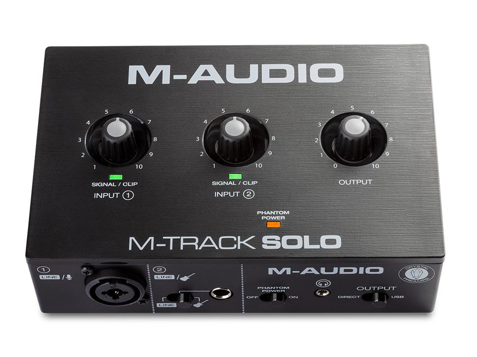 Beide Interfaces verfügen über zwei Audioeingänge, wobei sich das Duo beim zweiten Eingang flexibler zeigt. Es besitzt zwei XLR/Klinke-Kombibuchsen, die jeweils Mikrofon, Instrument oder Line-Signal aufnehmen können. M-Track Solo besitzt nur eine Kombibuchse, die auch nur für Mikrofon oder Line-Signal geeignet ist. Der zweite Eingang ist als reine Klinkenbuchse für Line- oder Instrumentensignal ausgelegt. Bei beiden Interfaces lässt sich Phantomspeisung für Kondensatormikrofone aktivieren.