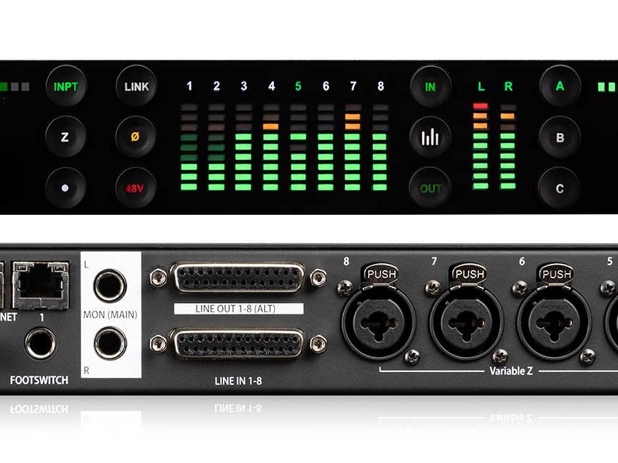 Die Rückseite bietet acht XLR/Line-Kombi-Eingänge, jeweils mit Preamp und Phantom-Power, vier davon mit variabler Impedanz, zur individuellen Anpassung ans anliegende Signal. Acht alternative Eingänge können über eine Kabelpeitsche im Sub-D-Format angeschlossen werden, gleiches gilt für die separaten Ausgänge. Diese sind allerdings nicht im Lieferumfang enthalten und schlagen nochmal mit je über 100 Euro zu Buche. Bei einem Anschaffungspreis von über 4.000 Euro dürften gern welche inklusive sein.