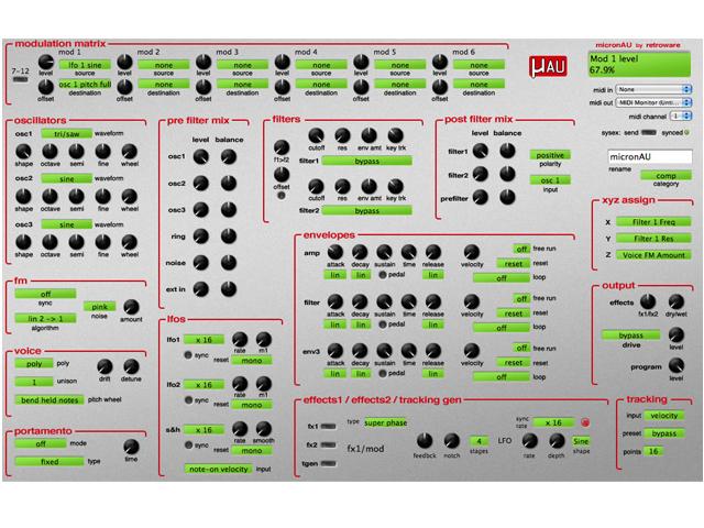Da Alesis selbst keinen Editor für den Micron anbietet, hat die Softwareschmiede RetroWare mit micronAU ein Audio-Unit-Plug-in zur Steuerung des kleinen Klangerzeugers gestrickt.