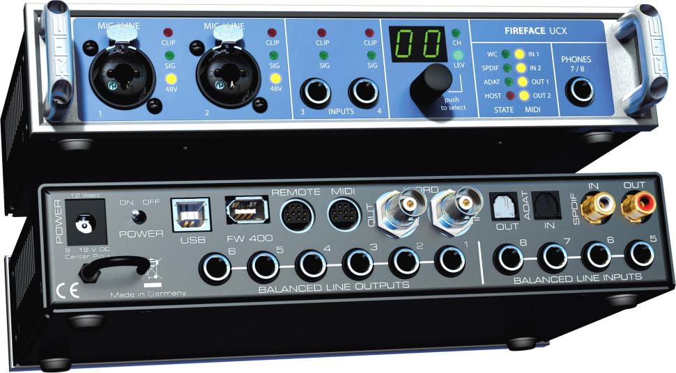 Optisch unterscheidet sich das Fireface UCX nicht wesentlich von seinem Vorgänger. Die Frontplatte ist weitgehend identisch. Rückseitig ist neben dem Firewire-Port lediglich ein zusätzlicher Anschluss verbaut, der dem Anschluss eines Remote-Controllers dient – zweifellos eine Hommage an das sehr schnell populär gewordene Babyface. Neben der Standardversion mit zwei Tastern und einem riesigen druckempfindlichen Endlos-Encoder gibt es auch eine aufgebohrte Variante namens „Advanced Remote Control“. Diese bietet sechs weitere Bedienelemente für zum Beispiel Mono-, Talkback- oder Mute-Funktionen.
