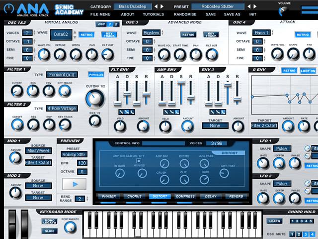 Doch genug der Palindrome. Der griffige Name des Plug-ins von Sonic Academy steht für „Analog.Noise.Attack” und bringt die Besonderheiten des Synthesizers auf den Punkt. Neben zwei virtuellen analogen Oszillatoren verfügt er über zwei weitere Oszillatortypen: Während der „Advanced-Noise“-Oszillator mit rauschhaften PCM-Wellenformen aufwartet, dient das „Attack“-Modell der Betonung des Anschlags eines Klangs. Insgesamt stehen stolze 57 verschiedene Wellenformen zur Wahl, wodurch ein breites Spektrum zwischen analogen und digitalen Standards, rauschhaften Klängen sowie elektrischen und akustischen Instrumentensounds abgedeckt wird. Bei einem modernen virtuell-analogen Synthesizer darf natürlich auch eine Unisono-Funktion nicht fehlen. Möglichkeiten zur Oszillatorsynchronisation sowie Pulsweiten-, Frequenz und Ringmodulation vermisst man hingegen.