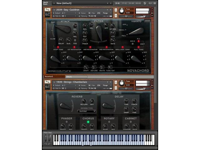 Da jedes Geräusch des Instruments aufgenommen wurde, gelang es den Sample-Spezialisten ein virtuelles Novachord in Kontakt zu modellieren. Dabei stehen dem Benutzer zwei Instrumente zur Auswahl: Neben dem NovaSynth mit zwei Layern inklusive eigenständiger Modulationseinstellungen wird der 1939/2039 NovaSynth geboten, für den das Signal jedes der sechs Oszillatoren sowie drei Vibrato-Intensitäten separat eingefangen wurden. Wie bei dem Originalinstrument können Sie die Klangfarben mischen. Der 2039-Modus bietet zusätzlich für jeden der sechs Kanäle umfangreiche Modulationsmöglichkeiten. Für den gewünschten Retro-Klang sorgt eine Effektsektion mit Faltungshall, Delay, Phaser, Chorus, Rotationslautsprecher und modelliertem Lautsprecher.