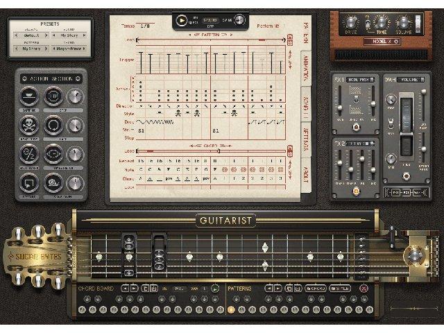 Mit ihrem Guitarist versprechen die Kreativköpfe von Sugar Bytes frischen Wind in die Welt der Gitarrenemulationen zu bringen. Der virtuelle Rhythmusgitarrist zeigt sich mit seinen drei aufwendig gesampleten E-Gitarren Fender Stratocaster, Telecaster und Duesenberg Starplayer sehr variabel, nur eine Gibson Les Paul vermisst man noch. Dank eines ausgeklügelten und intuitiv bedienbaren Step-Sequenzer-Systems lassen sich mit dem Plug-in auf einfache Weise überzeugende Gitarrenriffs erstellen.