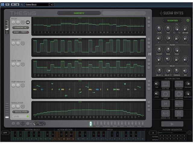 Ganz klar, Thesys orientiert sich am Konzept klassischer Drumcomputer, präsentiert sich aber in einem ansprechenden und frischen Design, welches die vielfältigen Möglichkeiten intuitiv nutzbar darstellt. Geliefert wird das Programm mit über einhundert Sequenzer-Presets, die wiederum bis zu sechzehn verschiedene Patterns enthalten können. Das Hauptfenster von Thesys unterteilt sich in fünf Abschnitte und beherbergt den Pitch-, Velocity-, Gate-Time-, Performance- und Modulationssequenzer. Ersterer definiert dabei die Notenhöhe für jeden einzelnen Step. Zudem lassen sich verschiedene Skalen, wie zum Beispiel Kirchentonarten oder pentatonische Muster, anwählen. Interessant ist die Aufnahmefunktion, mit der sich Notenwerte per Controllerkeyboard in den Pitchsequenzer schreiben lassen.